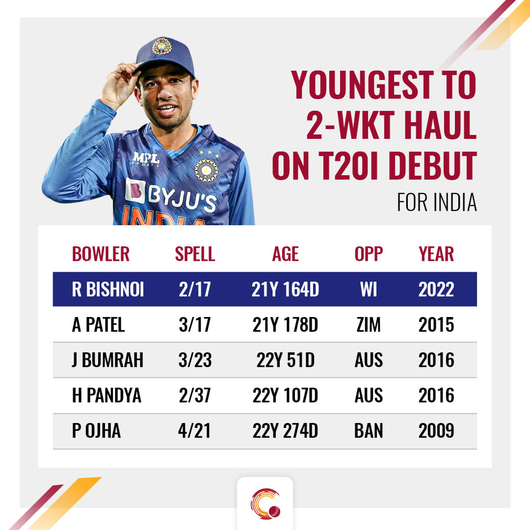 There were few nervous moments for him at the start. Took a catch of Pooran and stepped on the boundary banner and three wides in his first over. But, those were put behind in his second over as he bounced with a two-wicket over. In his four overs spell, Bishnoi gave away just 17 runs that included only one boundary. His spell of 2/17 was the third best by an Indian spinner on debut. To highlight more, out of the 13 Indian bowlers who have taken two-plus wicket hauls on debut, Bishnoi at 21 years and 164 days, is the youngest.