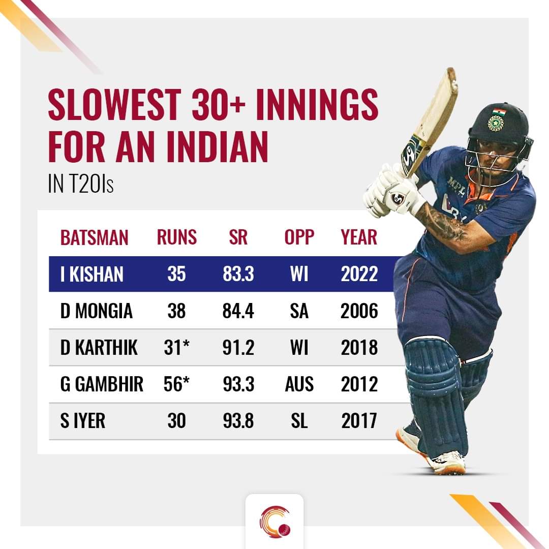 In this match, after batting 42 balls, Kishan scored only 35 at a strike rate of 83.3. In his T20 career where he has batted for more than 30 balls, only once has he batted slower than this and it was against Bengal while playing for Jharkhand in Syed Mushtaq Ali Trophy 2014/15. To his worst, this innings also recorded the slowest innings for an Indian in T20Is (30+ score).