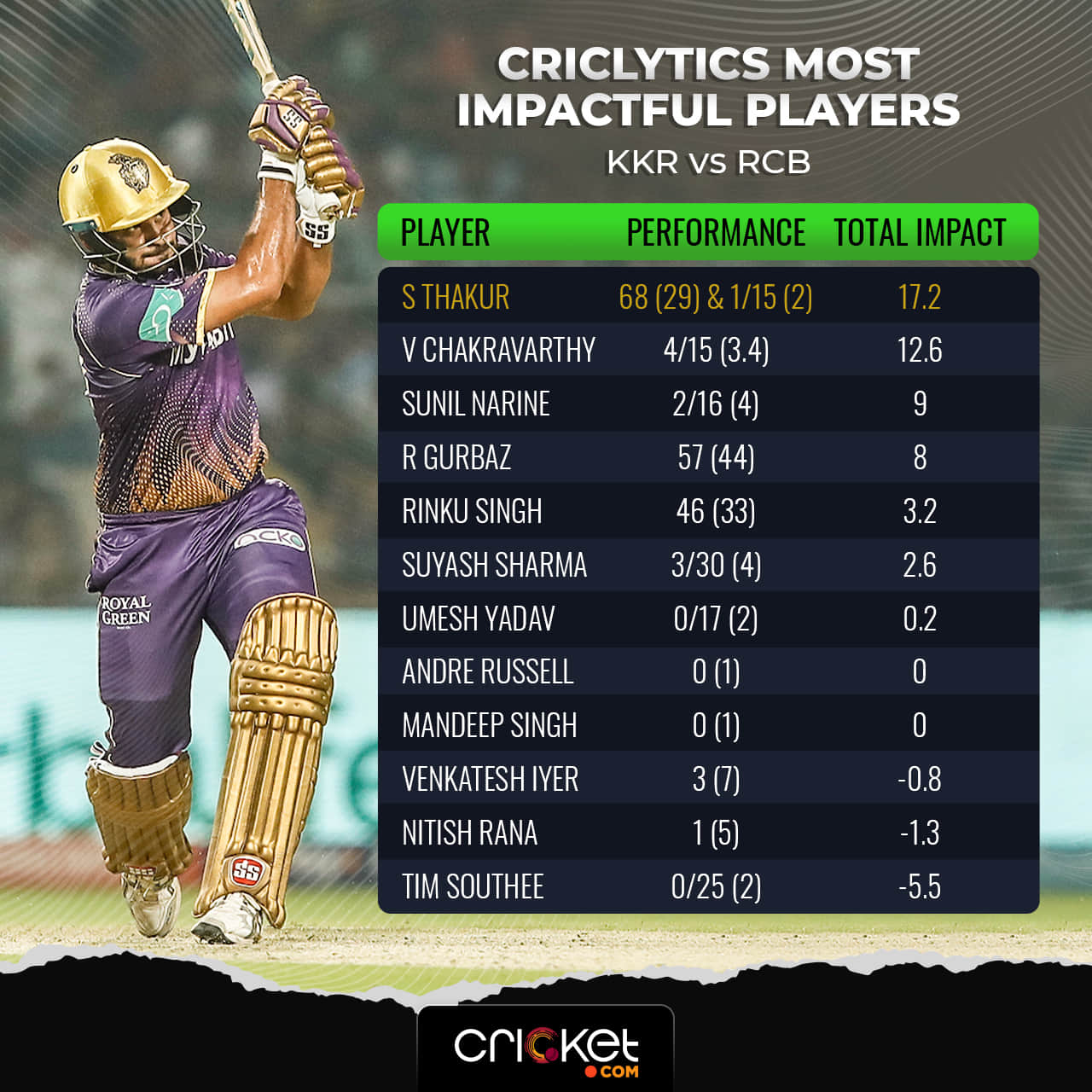 Every shot, every attempt to clear the infield bled of intent. Thakur was on 42 off 15, and KKR 140/5 after 15 overs. The impact is vividly visible, in the span of 15 deliveries, the Mumbaikar changed the complexion of the entire encounter and showed RCB that he was indeed made of a different gravy.