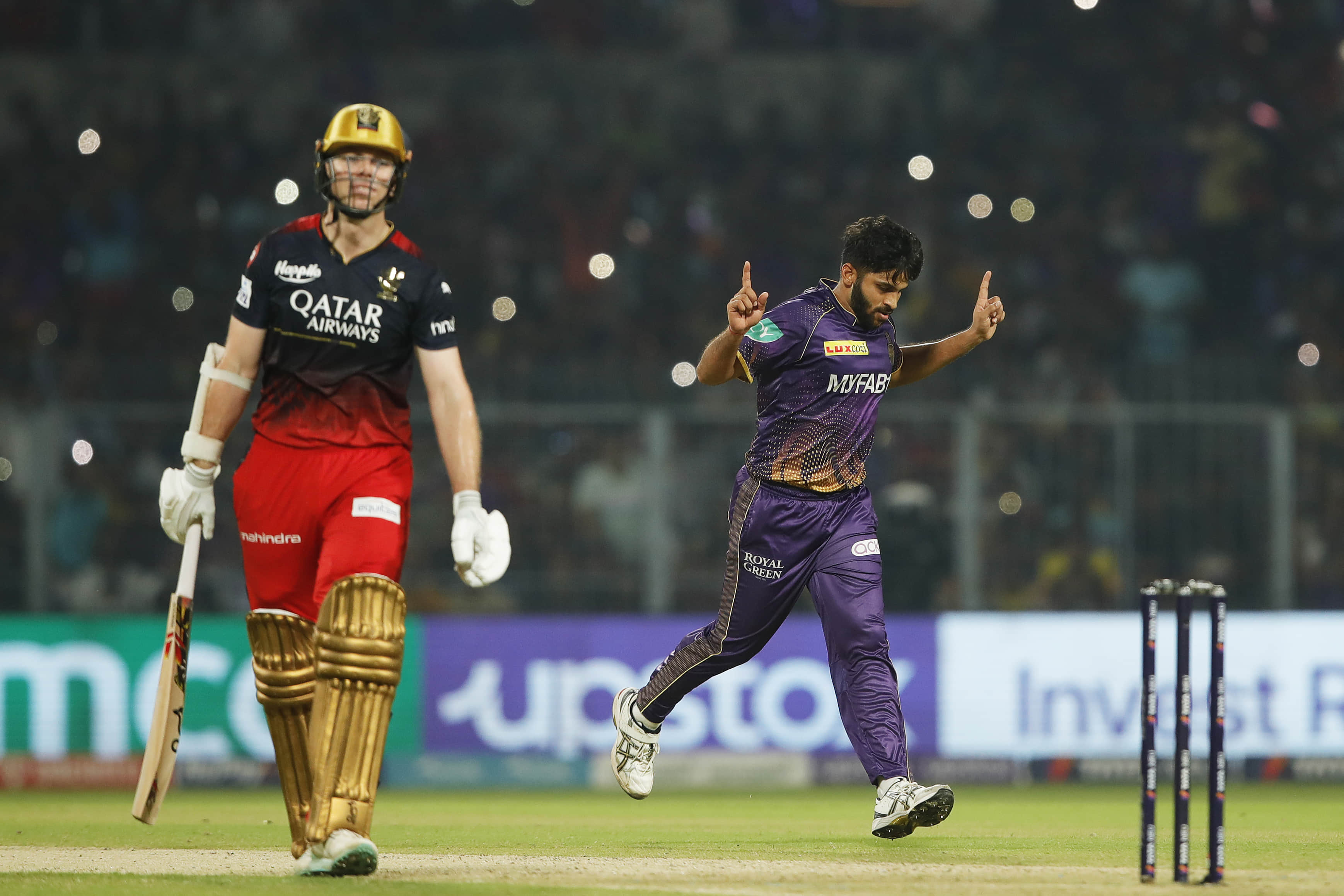 Two wickets in two balls, Karn Sharma is ripping apart here at the Eden Gardens. The crowd has gone silent, but a big portion of RCB fans are up on their feet. RCB, RCB, RCB, the cheers are not what you would have expected at the Eden but the pull that Kohli has at the venue is quite the thing.