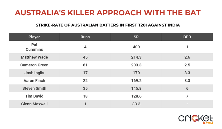 Smith, who tends to be a slow-starter too played a vital 24-ball 35. Despite their star Glenn Maxwell failing (1), Australia found an approach that was so damning to destroy the Indian bowling unit, it fetched a boundary every 3.4 deliveries.