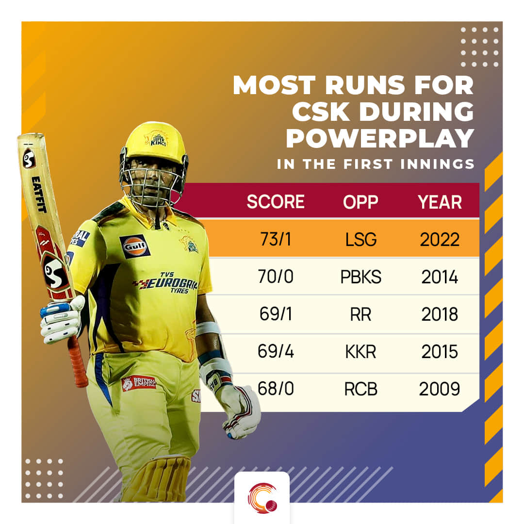 Uthappa was the major destroyer as he scored 45 runs out of the 73 scored by Chennai in the first six overs. While batting first, the 45 runs scored by Uthappa is the joint best for Chennai batter alongside Matthew Hayden in 2009. Also, the 73 runs scored by Chennai, is their highest powerplay score while batting first in IPL.