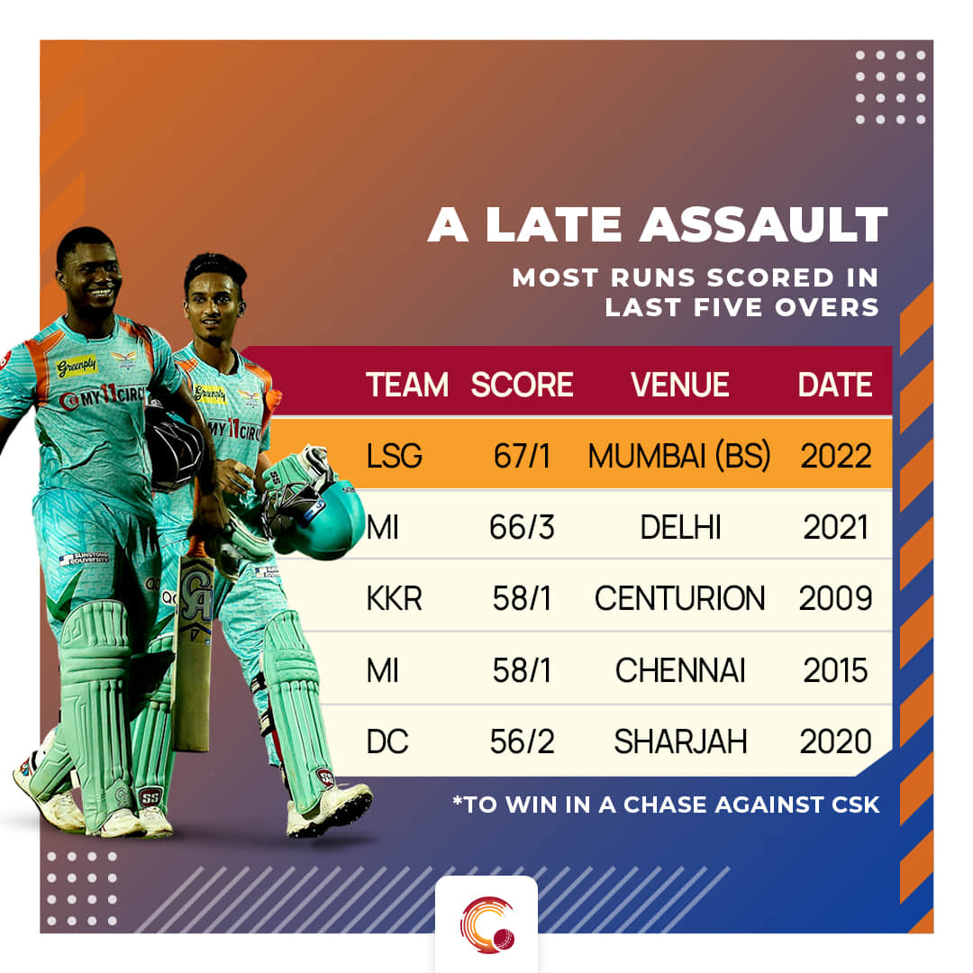 Lewis was doing the bulk of the scoring in the phase between overs 11-15, but Lucknow were losing wickets at the other end. In any case, Chennai were left with two overs from weak link bowlers. Lewis and Ayush Badoni made full use of it as they carted Shivam Dube for 25 runs in the 19th over. Eventually, Lucknow were able to gun down 67 runs in the last five overs, which is the highest for a team while chasing against Chennai in IPL.