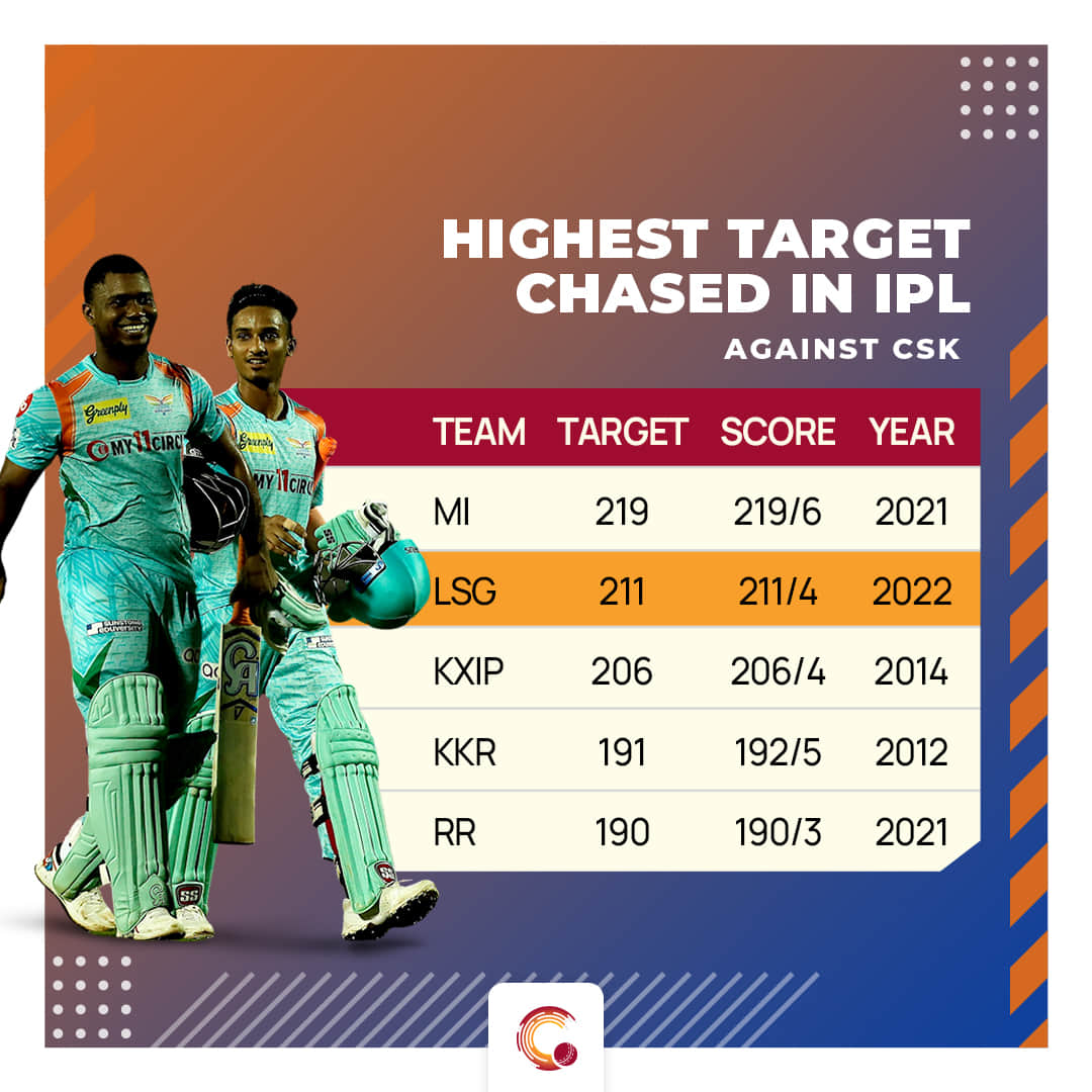 After setting a mammoth total of 211, Lucknow were left with a daunting task and their batsmen were up to it. By virtue of chasing the target of 211, Lucknow registered the second highest chase against Chennai in IPL. Mumbai Indians in 2011, chased 219 in Delhi, which still remains the highest.