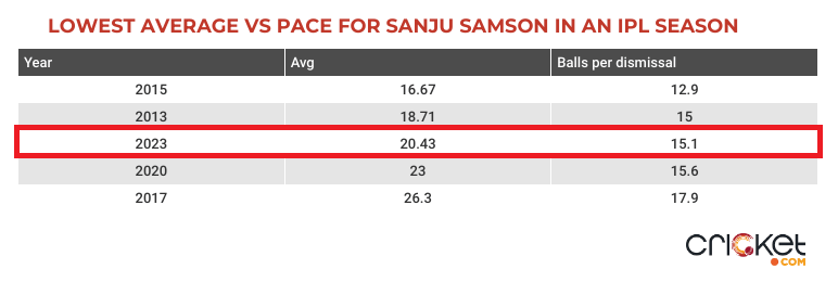 In IPL 2023, Samson has fared uncharacteristically badly against pace bowling.