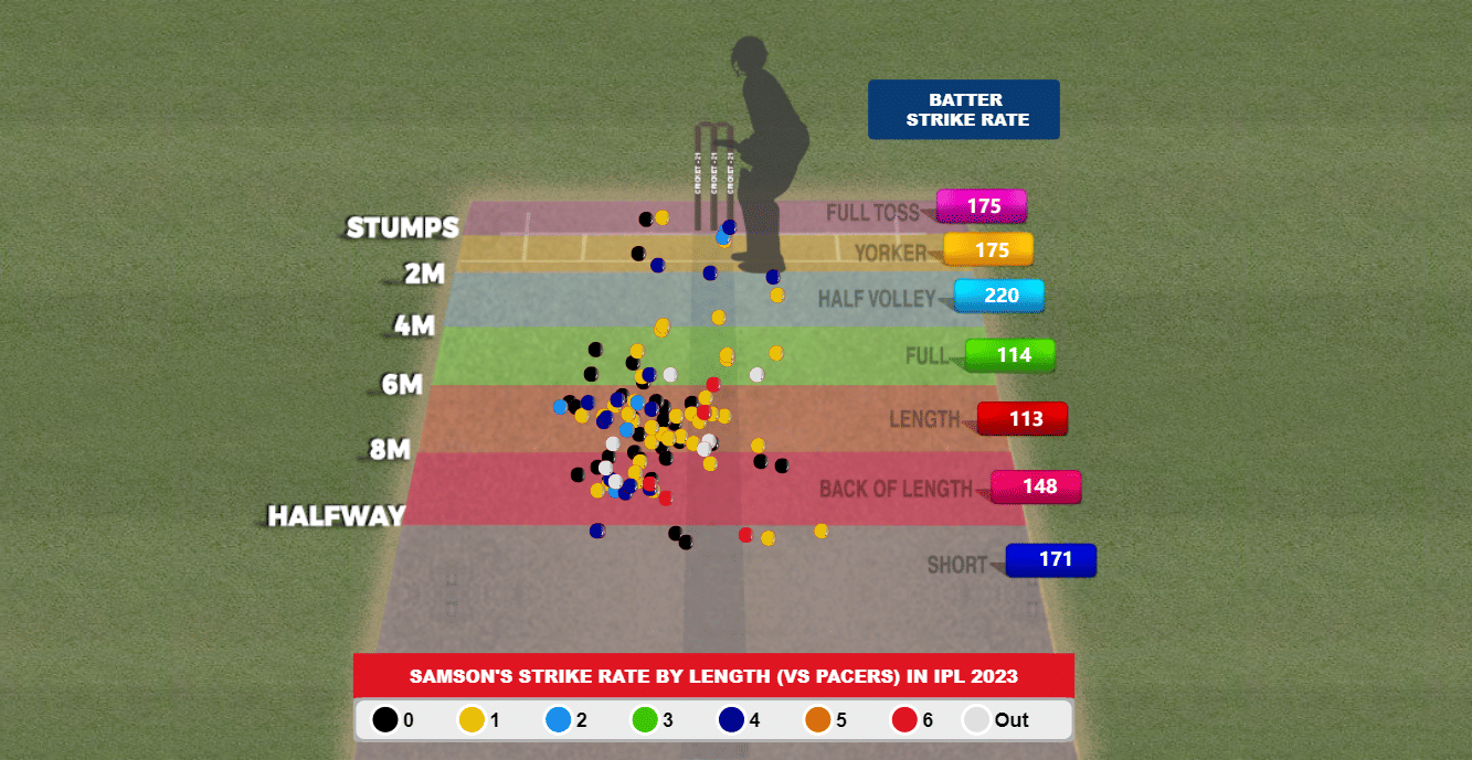 A close inspection of the lengths bowled to Samson by the pacers suggests that he’s been undone by hard lengths. Nearly 45% of the balls bowled by pacers this season have been in the 6m-8m range and he’s managed to collect just 53 runs off 47 balls while being dismissed thrice.