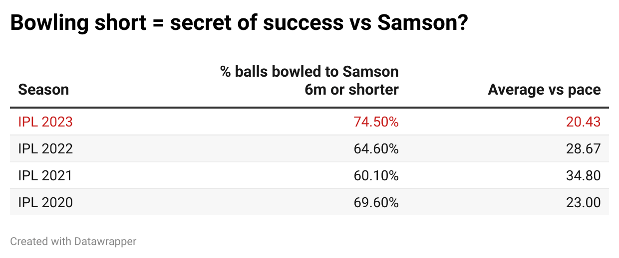 Turns out, this season, teams have consciously *targeted* Samson by bowling hard lengths / short balls, something they did not do across any of the previous three campaigns.