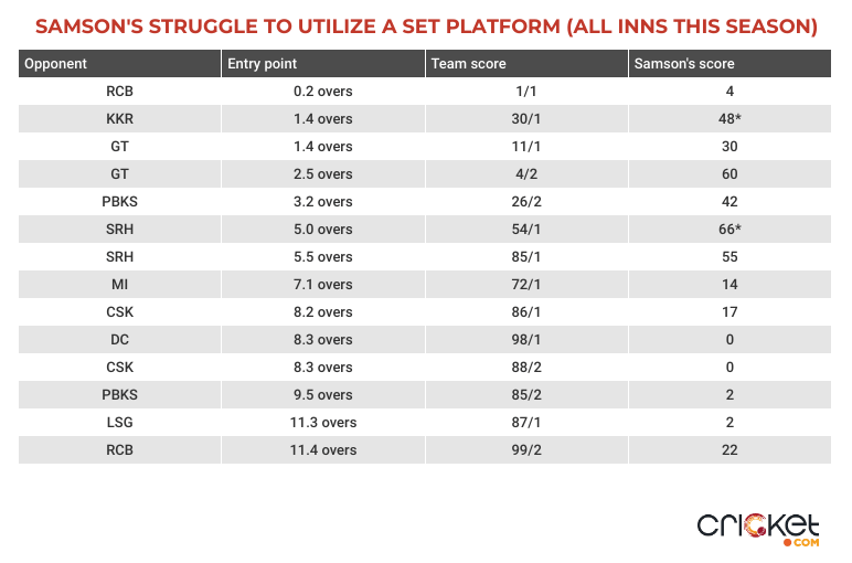 When his entry points have been inside the powerplay, Samson has averaged 75.25 and has struck at 171. Conversely, when he’s entered in the 9th over or afterwards, he’s averaged 8.14 and has struck at 103.6.