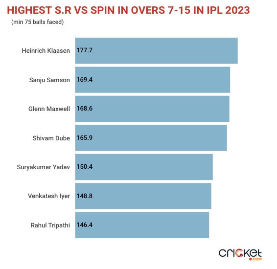 This season, only Klaasen (260), Gill (264) and du Plessis (275) have scored more runs against spin than Samson’s 219, and in the 7-15 phase, he’s remarkably smashed 183 runs vs spin at an average of 45.75 and SR of 169.4.