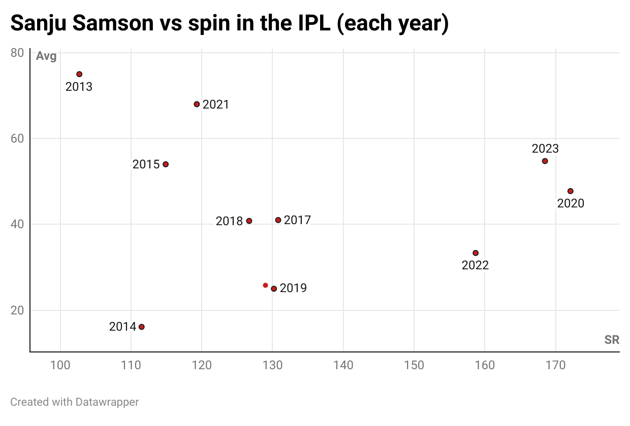 At a personal level, IPL 2023 has arguably been Samson’s best-ever season against spin bowling.