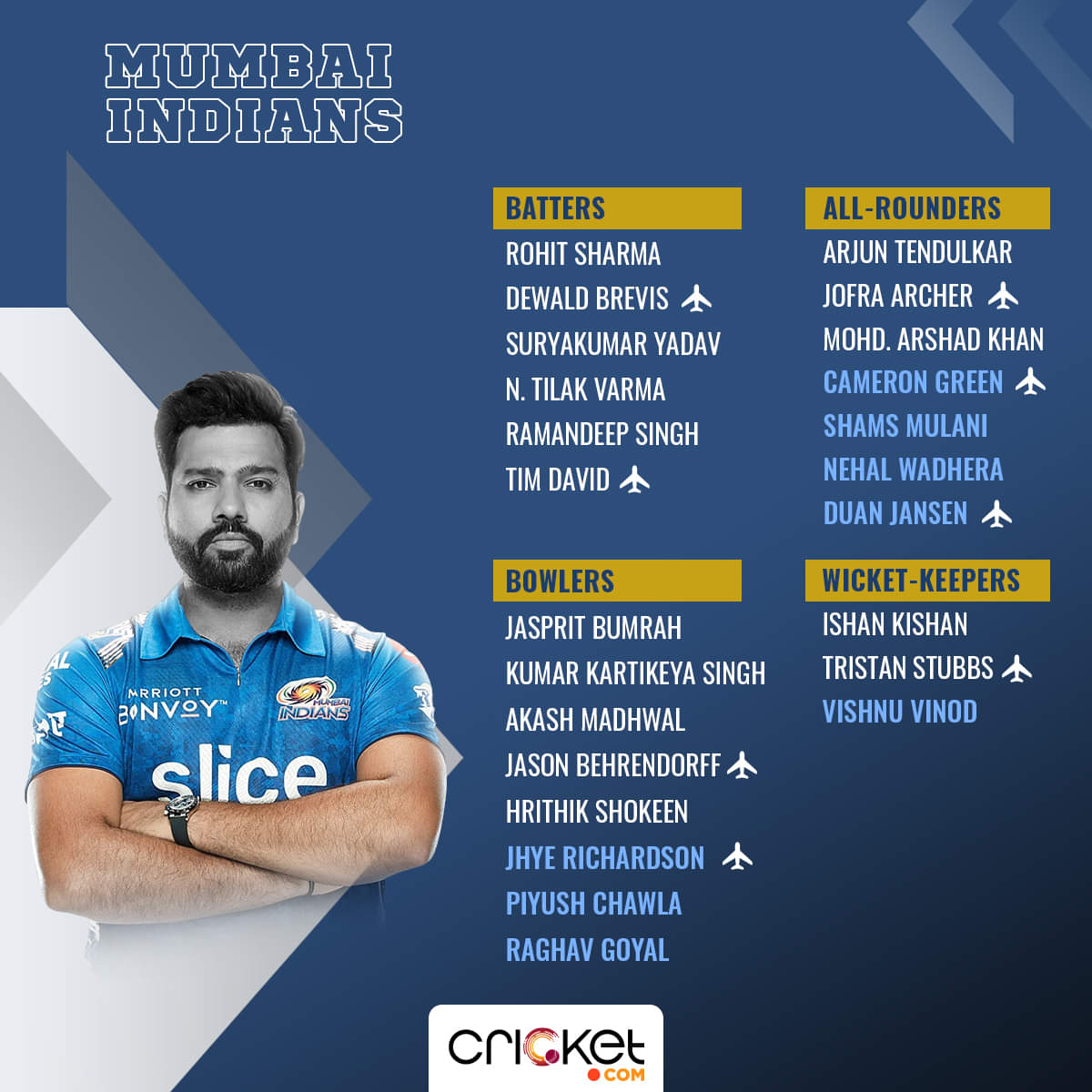 Rohit Sharma ( c ), Ishan Kishan (wk), Tilak Varma, Suryakumar Yadav, Dewald Brevis*, Cameron Green*, Tim David*, Hrithik Shokeen, Jofra Archer/Jason Behrendorff*, Kumar Kartikeya, Jasprit Bumrah