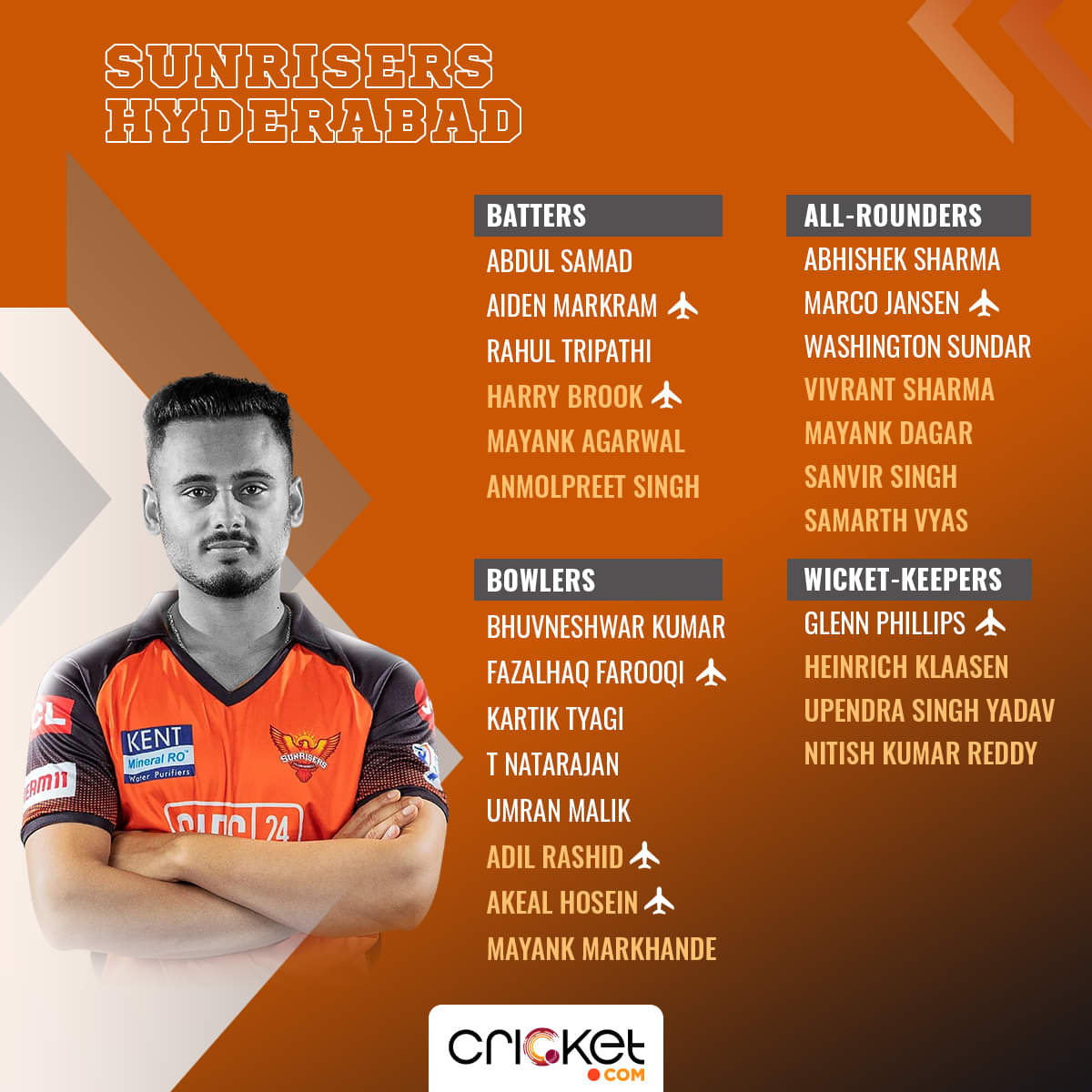Abhishek Sharma, Mayank Agarwal, Rahul Tripathi, Aiden Markram*, Glenn Phillips (wk)*, Harry Brook*, Washington Sundar, Bhuvneshwar Kumar, Adil Rashid*, Umran Malik, T Natarajan/Kartik Tyagi