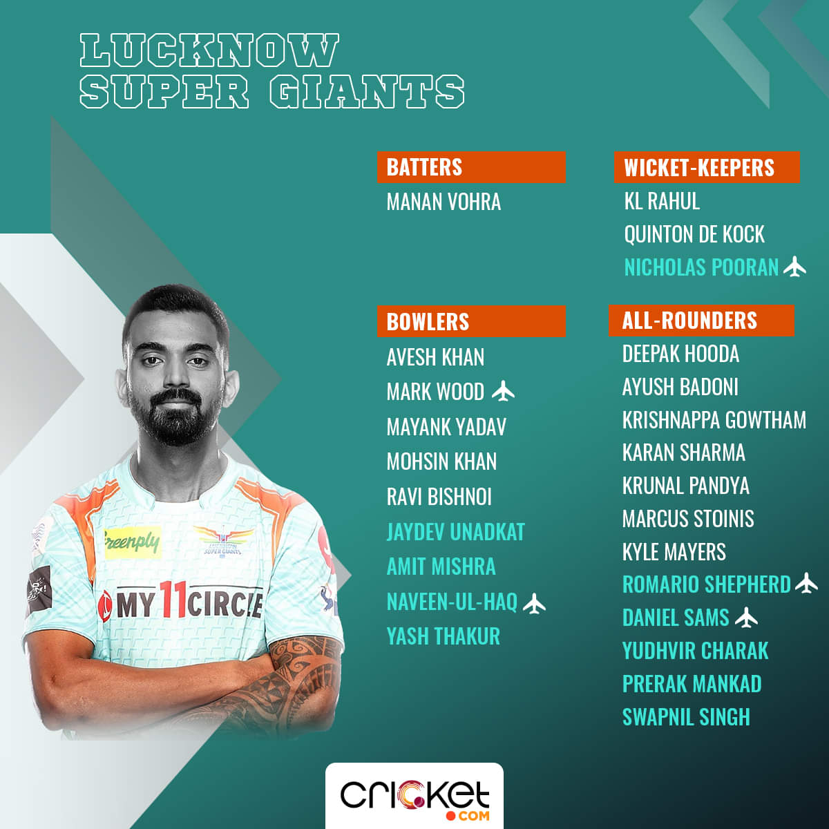KL Rahul ( c ), Quinton de Kock (wk)*, Nicholas Pooran*, Deepak Hooda, Marcus Stoinis*, Ayush Badoni, Krunal Pandya, Mark Wood*, Avesh Khan, Ravi Bishnoi, Mohsin Khan