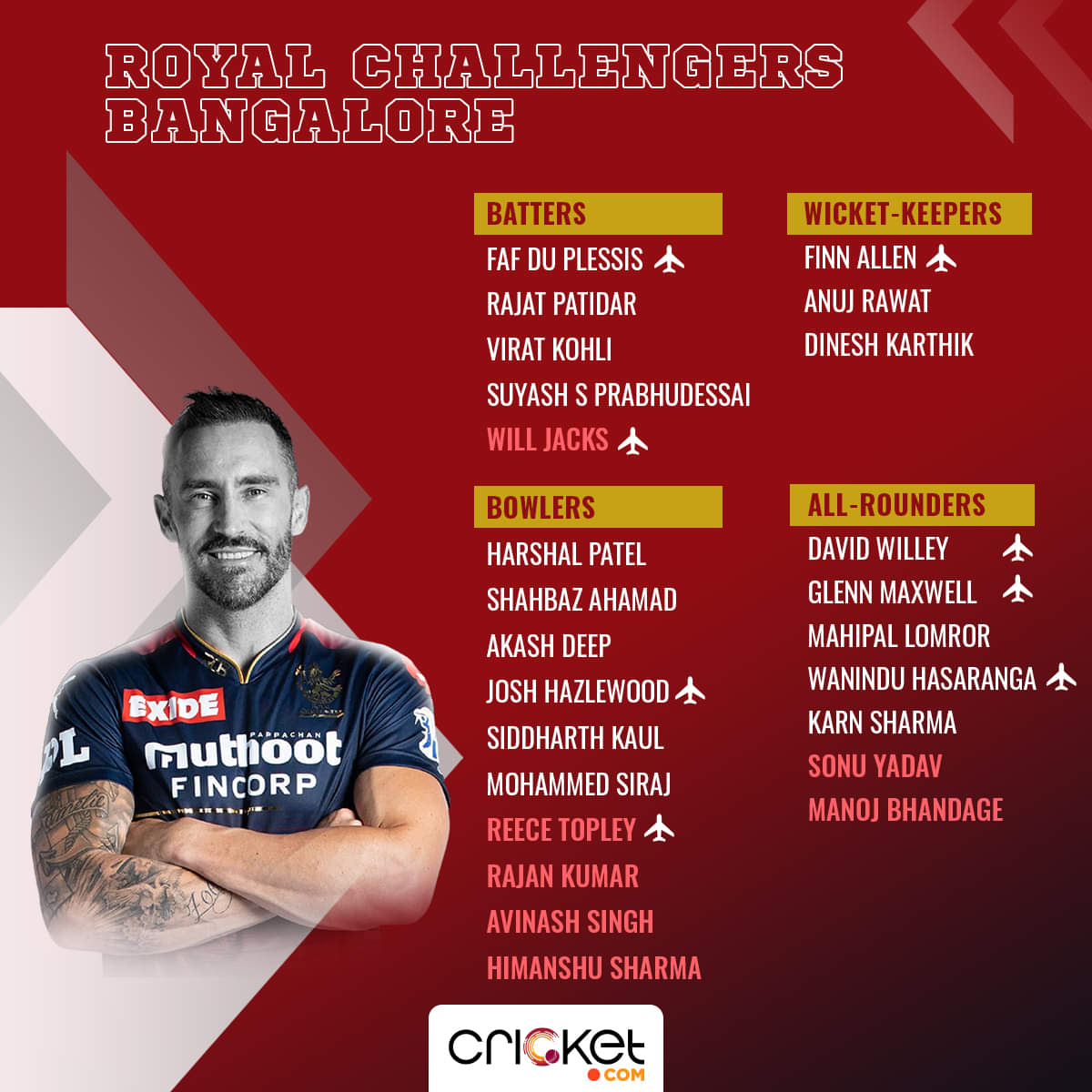 Faf du Plessis ( c )*, Virat Kohli, Rajat Patidar, Glenn Maxwell*, Mahipal Lomror, Shahbaz Ahmed, Dinesh Karthik (wk), Wanindu Hasaranga*, Harshal Patel, Mohammed Siraj, Josh Hazlewood