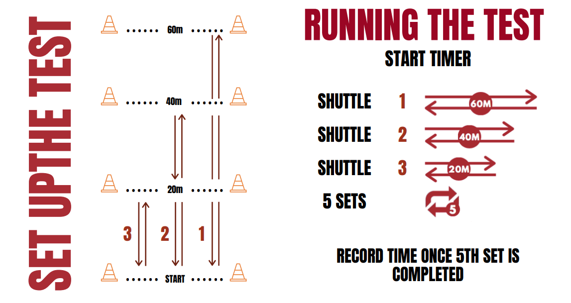 According to the Rugby Football Union, “The Bronco Test is a hard aerobic running assessment where participants have to complete a sequence of shuttle runs over 60m, 40m and 20m for five sets. The participants' aim is to complete the test in as quick a time as possible.” The total distance covered in the test is 1200 metres.