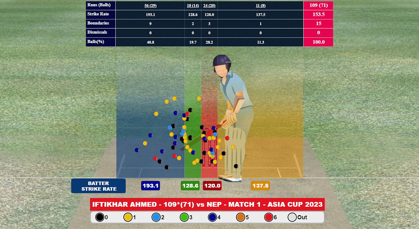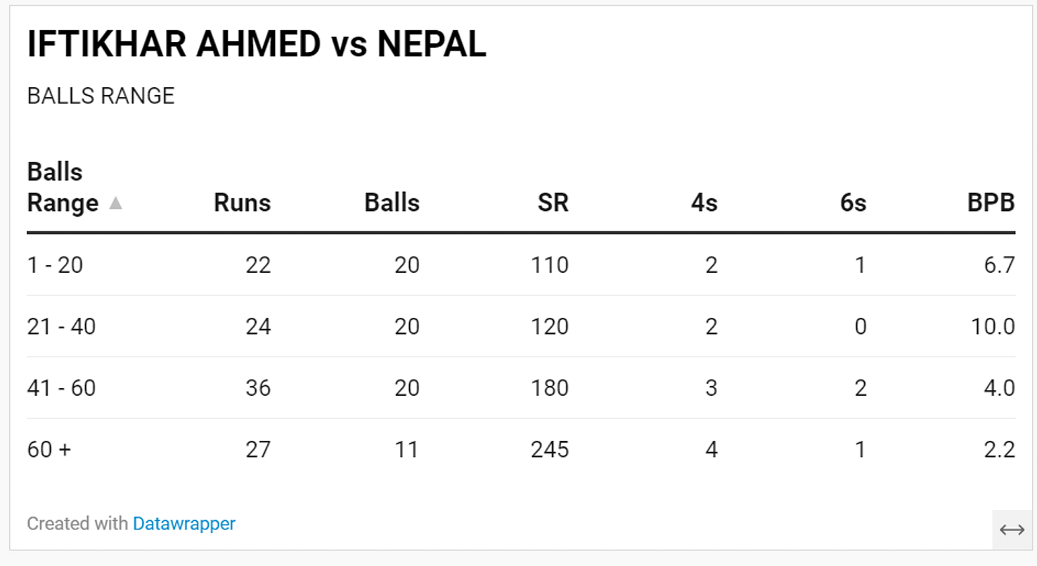 Poor bowling by Nepal too played its part. More than 40% of the deliveries were bowled outside the off stump and Iftikhar smashed them at a strike-rate in excess of 193.