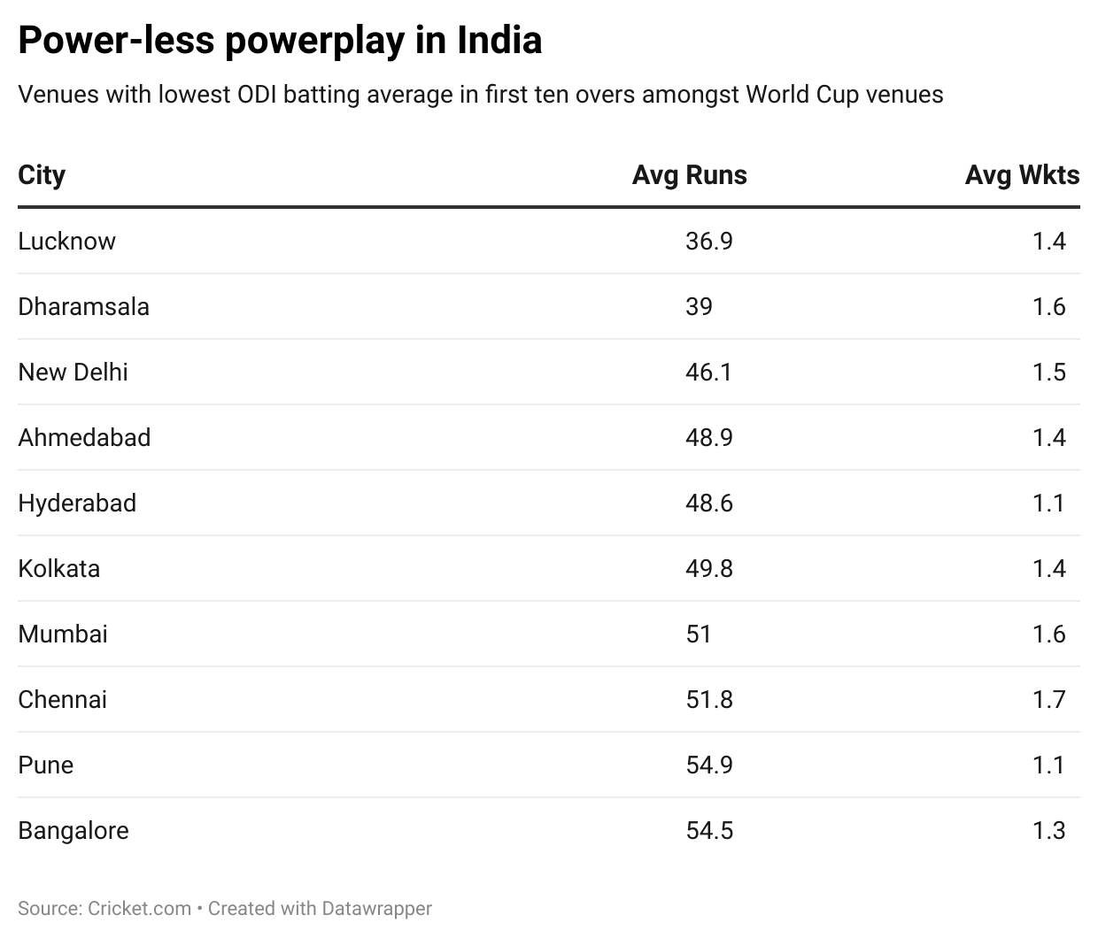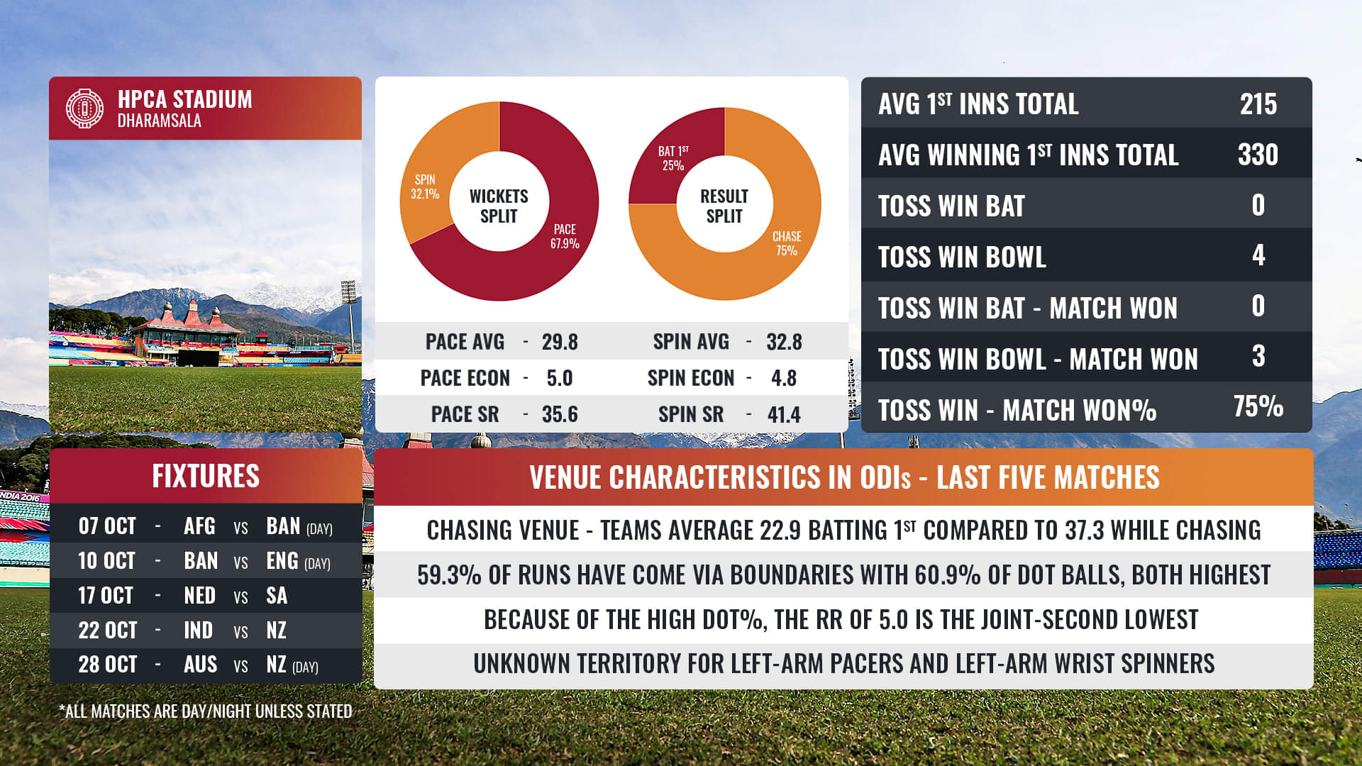 The wickets here in Dharamshala are perhaps as pace-bowling friendly as wickets could get in India. Yet again, amongst all ten venues in this year’s World Cup, the HPCA stadium ranks second-best for pacers, with a bowling average of 29.8, which is only marginally behind Chepauk’s 29.7. It makes pace bowlers as excited as any wicket in world cricket.