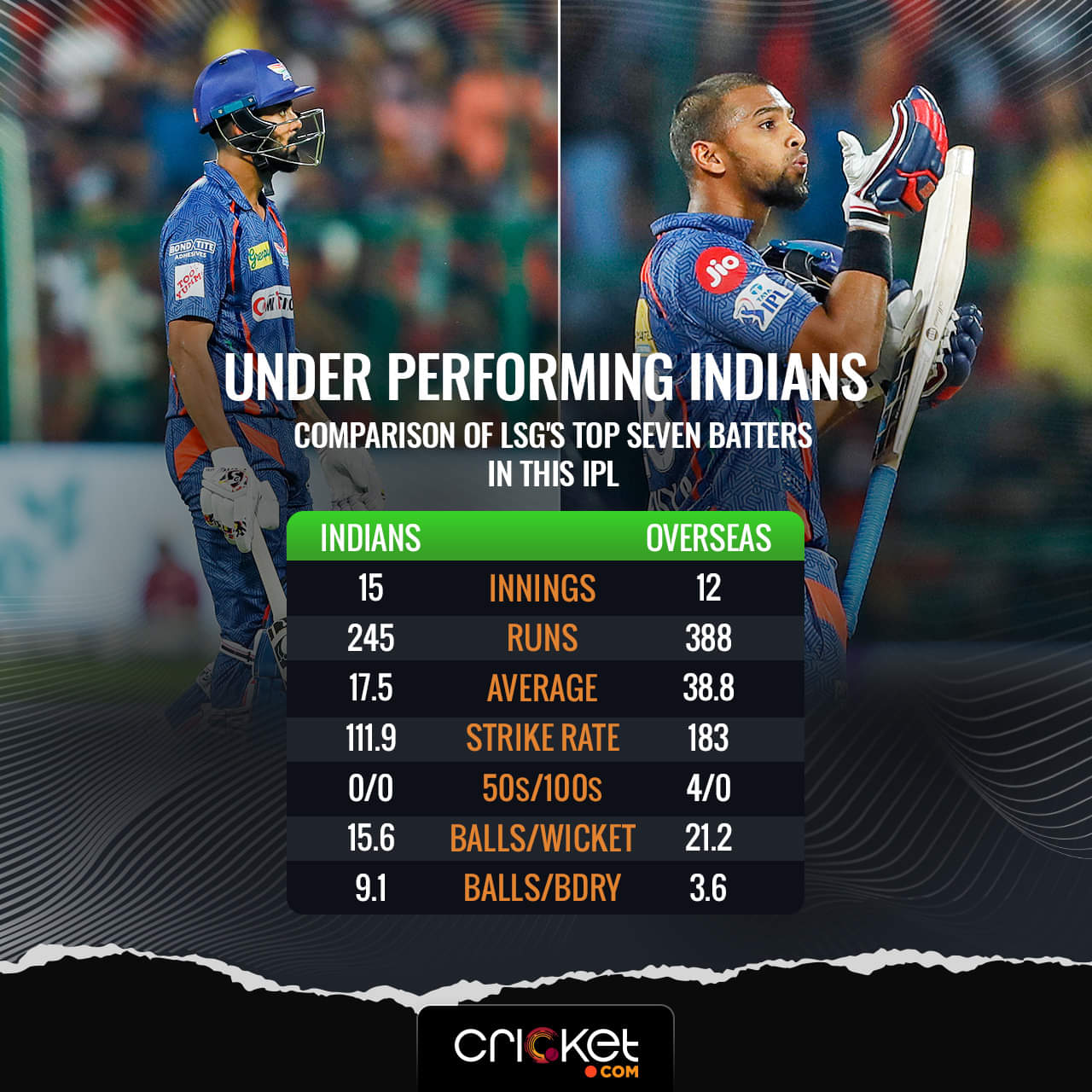 In comparison, the Indians have scored 245 runs at a strike rate of 111.9 and hit a boundary every 9.1 balls. No Indian batter has hit a 50+ score for Lucknow. Contrarily, there have been four by overseas batters.