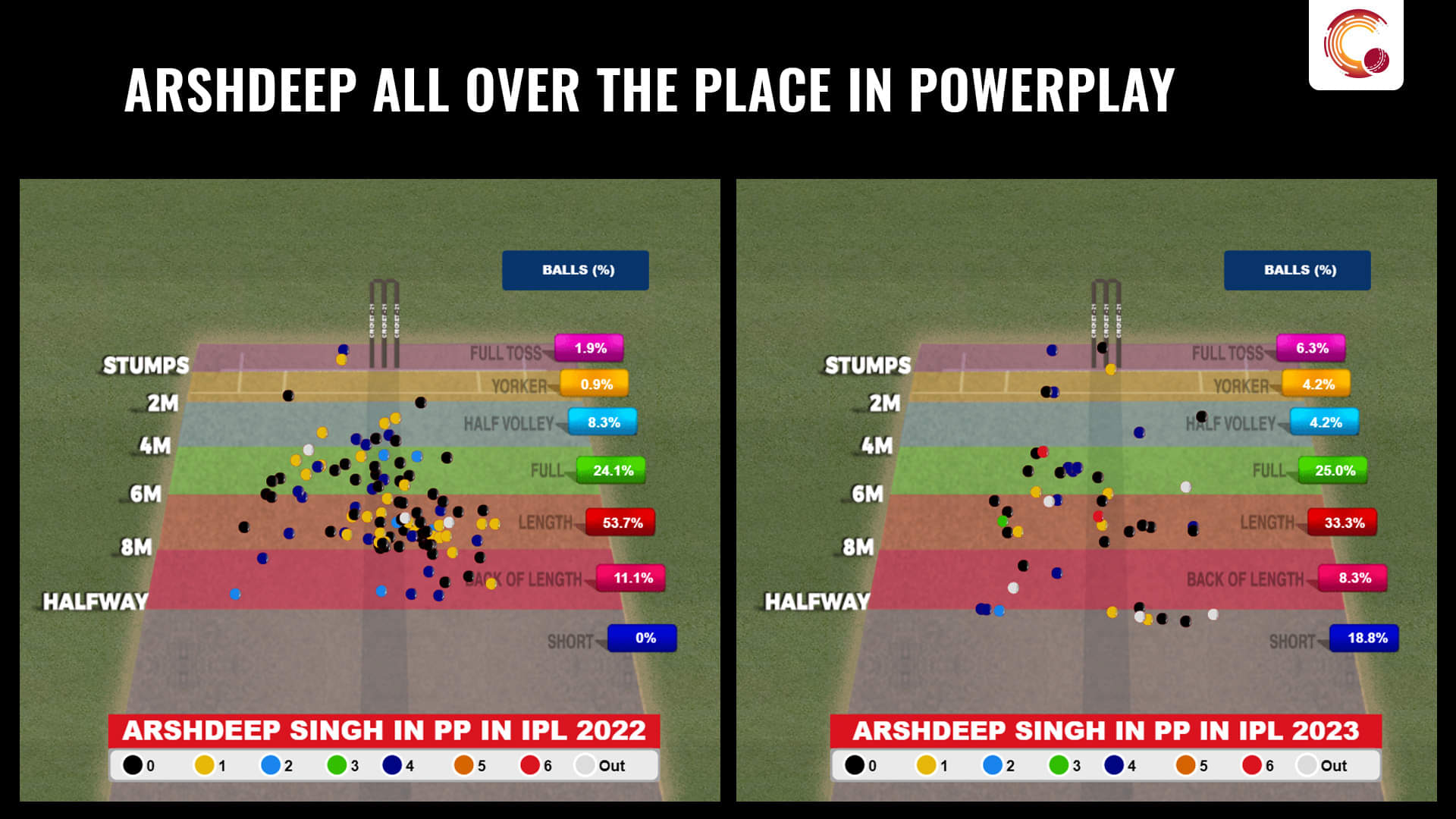 > In this IPL, Arshdeep Singh has picked up five wickets in the powerplay. However, he has leaked runs at an economy of 9.8. The reason behind that has been inconsistency in lengths.