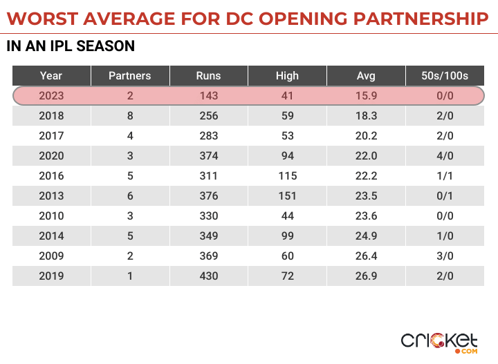 In the first two matches, David Warner and Prithvi Shaw posted 41 (9.1 RR) and 29 (10.9) for the first wicket. Post that, it has been either 30+ or less than two runs. Their partnerships read: 0 (3) vs RR | 33 (22) vs MI | 1 (4) vs RCB | 38 (27) vs KKR | 1 (3) vs SRH | 0 (2) vs SRH & 0 (1) vs GT (recent).