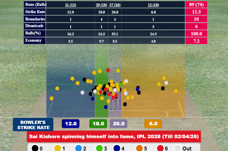 Against the Royal Challengers Bengaluru at the Chinnaswamy, Sai Kishore bowled a carrom ball (a new variation) to left-handed Krunal Pandya, who was flummoxed by the delivery that turned slightly into him rather than turn away from over the wicket. That was enough for him to lose his wicket. Moreover, he has targeted the stumps quite a bit this season and has mixed his variations quite well.