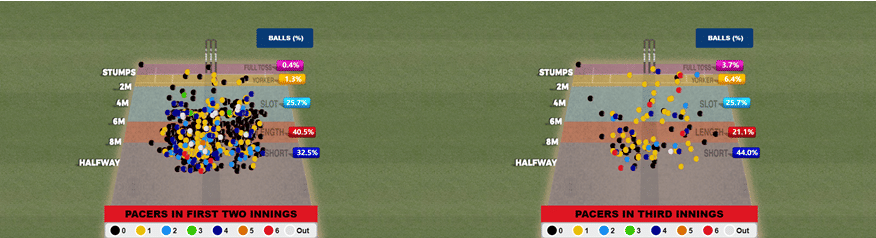 Although, in the WI bowlers’ defense, they had to resort to the short ball ploy because of how consistently they failed to hit the right lengths. The 143 overs bowled by pacers in the first two innings had seen them attack the 6m - 8m length a lot more. Over 40% of the balls bowled were in this region, and batters had only managed to score at 1.8 RPO. To set some more context, outside the 6m - 8m length, batters scored at 4.2 RPO in this Test.