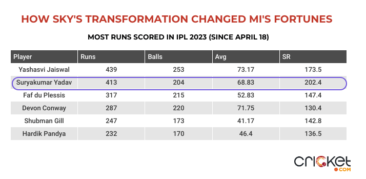 Since April 19, Suryakumar is the second-best batter in this year’s IPL, with 413 runs in the next seven matches. Provided that a lot of those innings came in extremely batting-friendly conditions at the Wankhede, the right-hander differentiated himself from the rest of the pack.