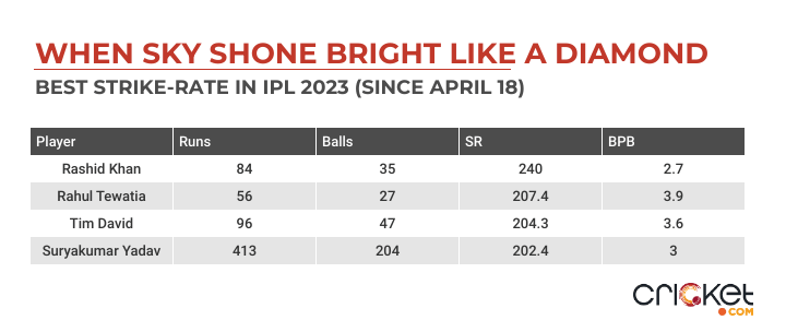 Not only did Suryakumar score 413 runs, his strike rate of 202.4 was only the fourth-best for any batter. The others above him: Rashid Khan, Rahul Tewatia and Tim David.