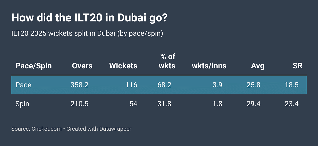 Over 569 overs were bowled in Dubai throughout the ILT20, and the domination from pacers can’t be more pronounced. The pacers took 116 of the 170 wickets (68.2%), averaging just 25.8. In terms of pure numbers, on average, 5.7 wickets fell in an innings to pace.