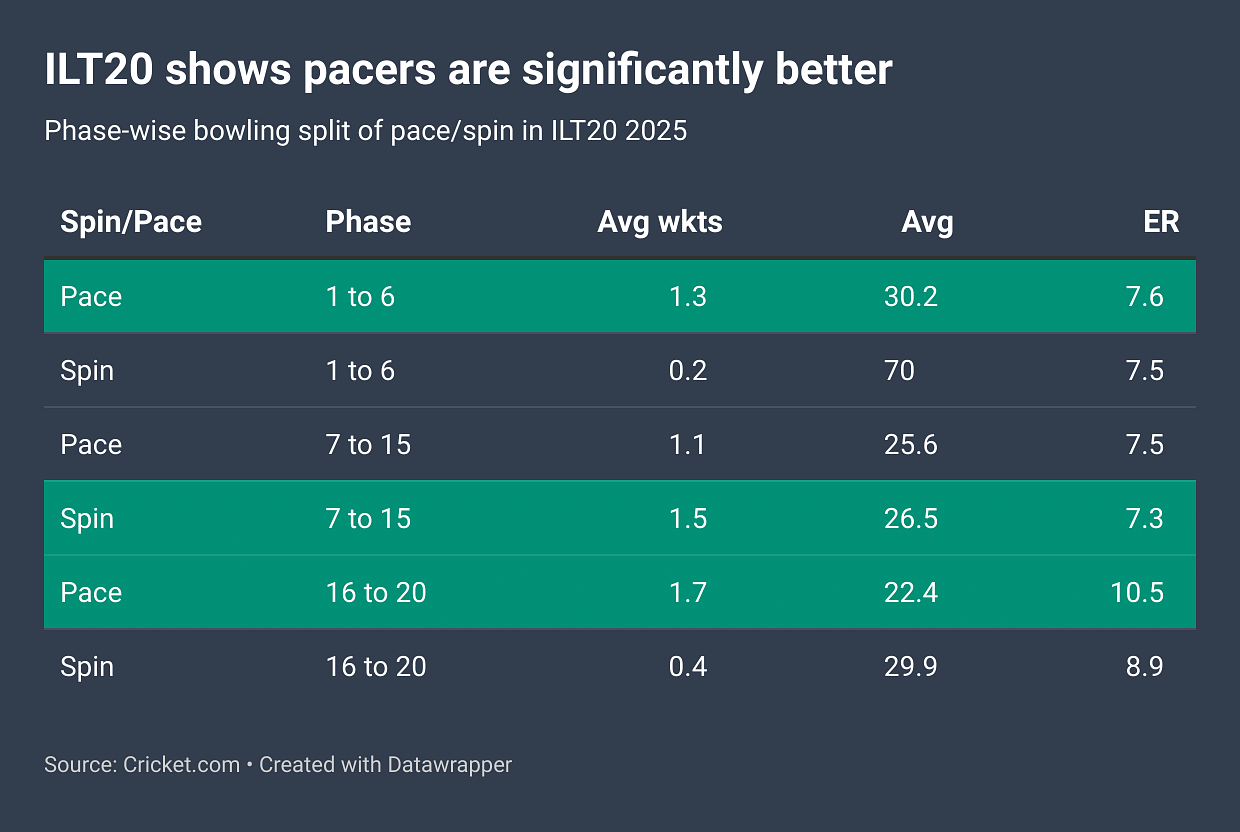 It isn’t that the pacers were only successful in the powerplay in ILT20 2025. The quicks averaged 30.2 in the powerplay, but as the game progressed in Dubai, they became increasingly handy. In the middle-over phase (7-15), the pacers scalped wickets at an average of 25.6.