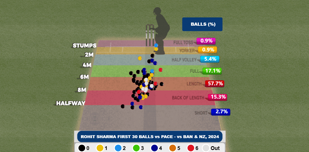 Rohit has also been challenged on his defense early on by seamers. 57.7% of the deliveries Rohit has faced early on (first 30 balls) from pace have been in good length area, accounting for all his six dismissals against pace in the last five Tests.