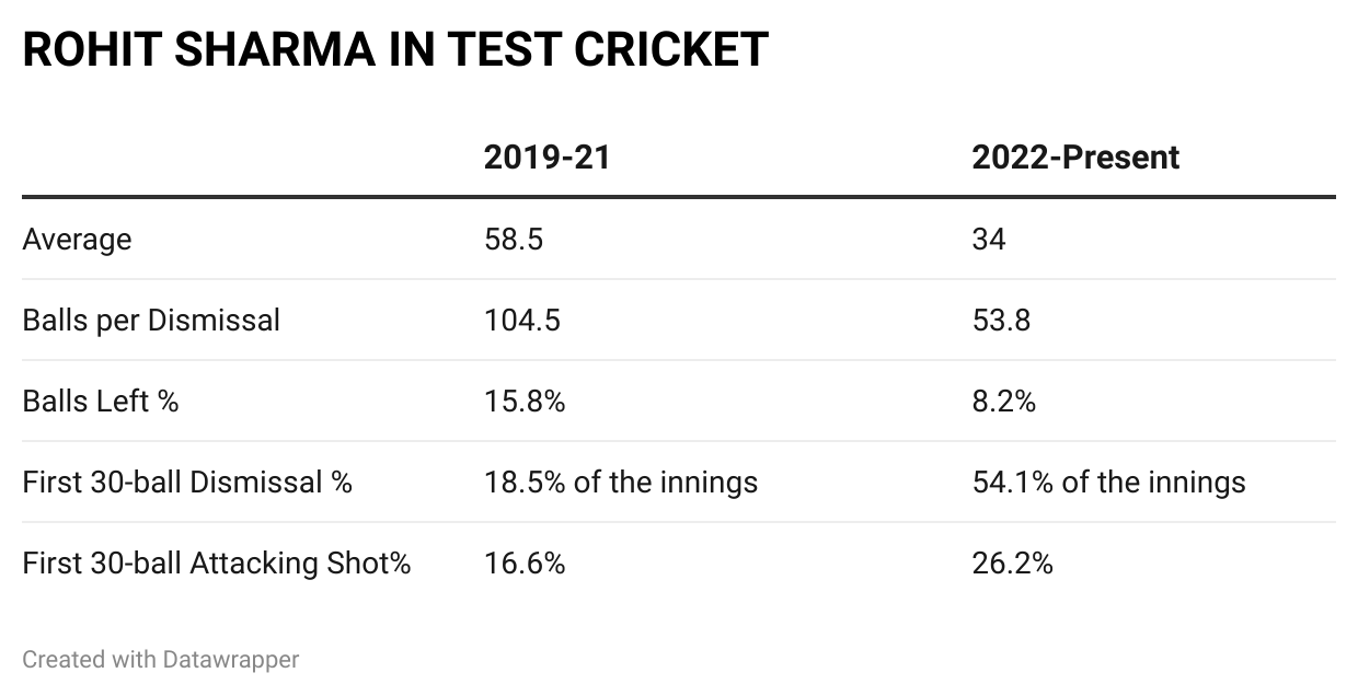 Rohit’s balls-per-dismissal ratio now falls fifth from below among the 18 openers with 10 Tests or more since 2022.