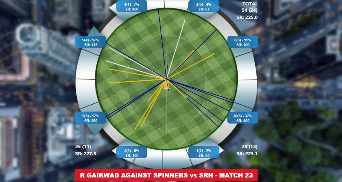 Once the spinners came on, Gaikwad feasted on them and caught up with du Plessis in the blink of an eye. Gaikwad scored 54 runs off 24 balls against the spinners, collecting 10 fours all around the park. Jagadeesha Suchith was carted for 45 runs in his three overs.