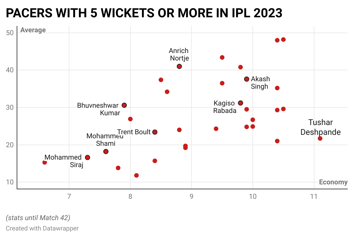 Deshpande is the only pacer to play all these nine games. He has a strange record. The 27-year old is the Purple Cap holder at this point with 17 wickets. But check this: among the 51 bowlers who have picked five wickets or more in IPL 2023, his economy of 11.4 runs per over is the worst.
