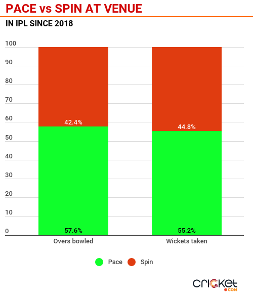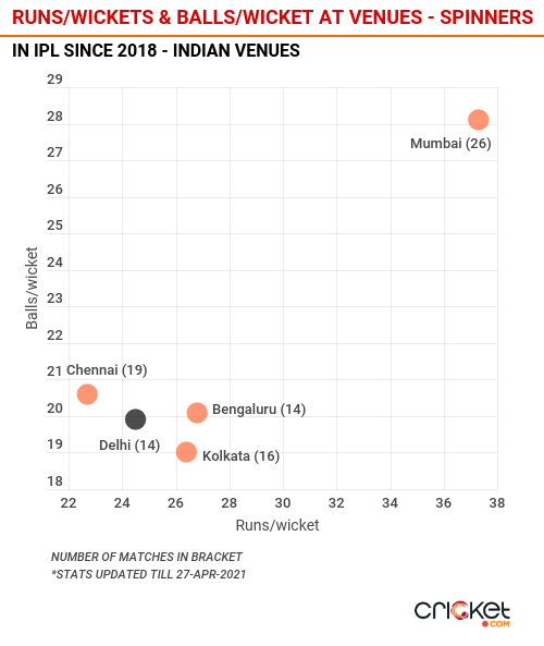 The wickets have come at regular intervals at the Arun Jaitley Stadium. A balls/dismissals ratio of 19.2 is evident enough. The spinners have been the ones who have been able to provide early breakthroughs. Among the six venues of this season, their bowling strike rate of 19.9 since IPL 2018 is the second-best. The 24.5 runs conceded by spinners for a wicket is also the second-lowest.