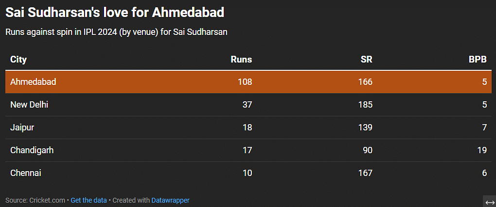 If you look at the way he has batted against spin in Ahmedabad, he has struck at 166.2. Overall, only at one venue in Delhi does Sudharsan have a better strike rate (166.7).