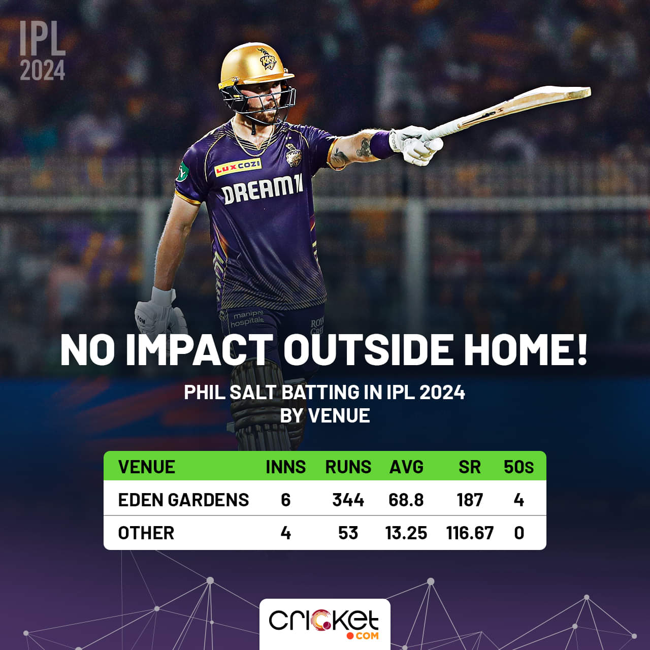 Of course. Phil Salt has scored 397 runs in this year’s IPL, but he often hits his runs at home. 86.6% of his all IPL runs this year have come at the Eden Gardens, where he has been quite a monster. In six innings at the venue this year, Salt has scored 344 runs, averaging a staggering 68.8, with an SR of 187.