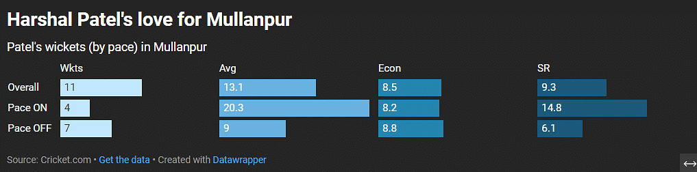 In Mullanpur, Harshal has bowled 7.1 overs of off pace, and the result has been largely successful, with seven wickets, averaging nine and striking every 6.1 deliveries, showing his prowess. It is that one particular ability of his alongside the slow wicket in Mullanpur that has resulted in his resurgence.