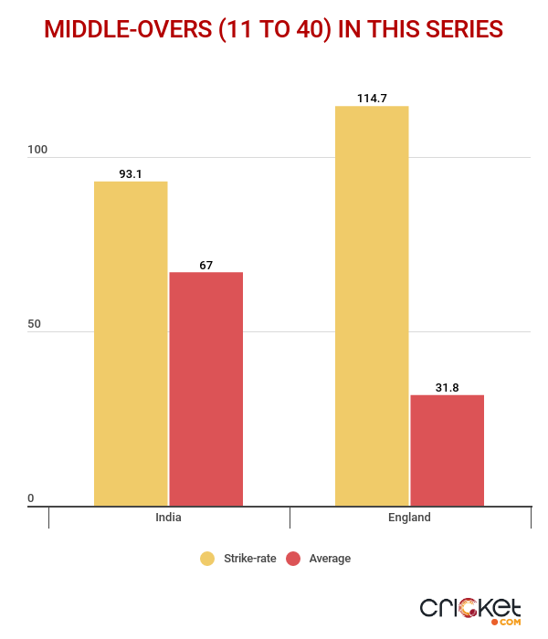 On the contrary, England are starting well with the new ball but are tipping off as the innings have progressed. Though Eoin Morgan and Jos Buttler, England’s captain in the first and the second ODIs respectively have stated that they were happy to restrict India to the eventual totals, it was possible because of the good work done earlier in the innings. During the death overs, England have an economy-rate of 11.9 runs per over.