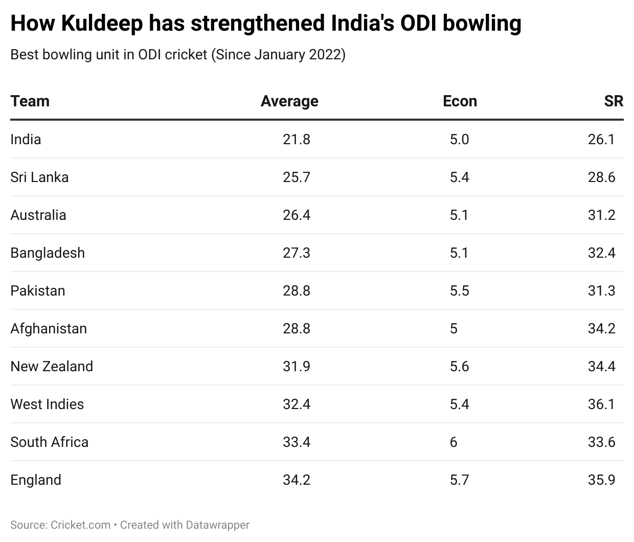 Since the start of the year, no Indian bowler has picked as many wickets as Kuldeep (31). That’s just one part of the package. Over the last two years, in wins, only Siraj (40 wickets) has contributed more to any top-ten side’s victory in ODI cricket than Kuldeep’s (38 wickets).