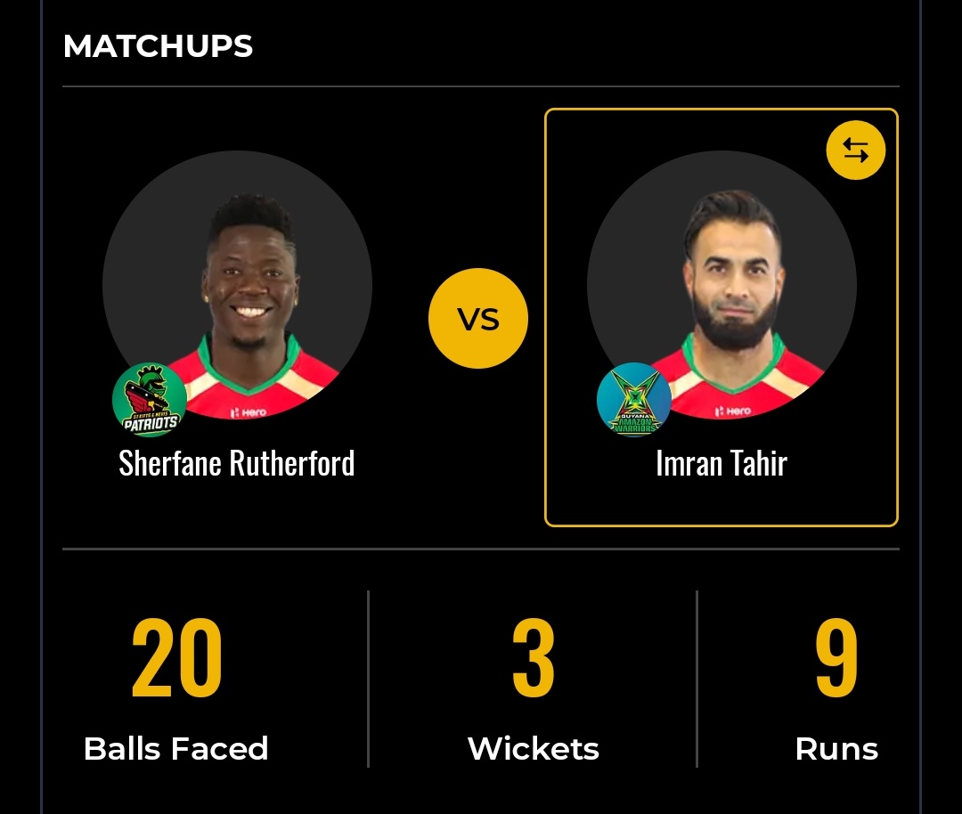 Imran Tahir definitely has the wood over Sherfane Rutherford, with three dismissal in 20 deliveries, conceding just nine runs against the left-hander. Watch out for the battle, with the left-hander striking the ball at just 45, in comparison to his CPL strike rate of 128.6.