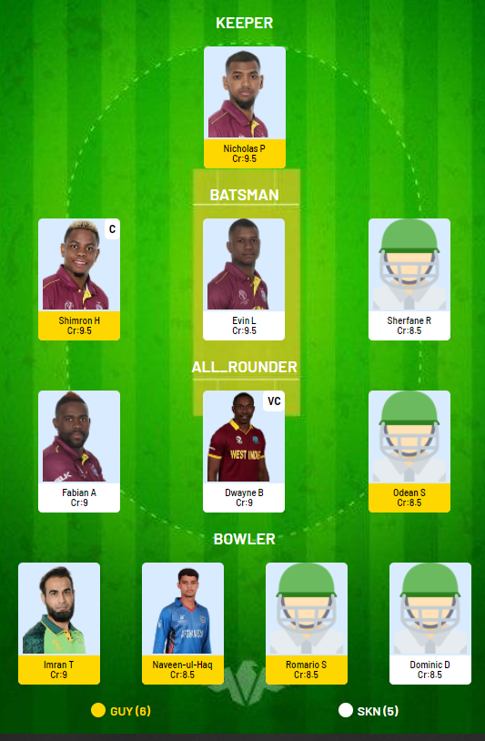 Guyana Amazon Warriors: Chandrapaul Hemraj, Brandon King, Odean Smith, Shimron Hetmyer, Shoaib Malik, Mohammad Hafeez, Nicholas Pooran (c & wk), Romario Shepherd, Naveen-ul-Haq, Ashmead Nedd, Imran Tahir