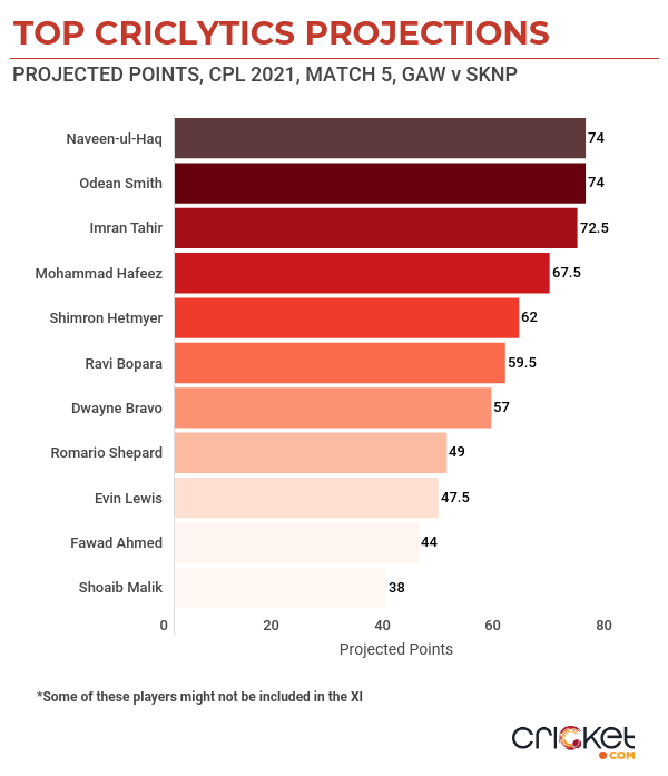 Last season, Dwayne Bravo was at his scintillating best with the ball for Trinbago Knight Riders, with nine wickets in the tournament. But this season, for the St Kitts and Nevis Patriots, the all-rounder has begun the season on a high, with a batting masterclass, scoring a 35-ball 47 against the Barbados Tridents in the franchise’s CPL opener, smacking four sixes in the process. While he was costly with the ball in that game, he is certainly an X-factor, considering the Criclytics, which predicts that he will score 13-19 runs and pick 0-1 wickets in this match.