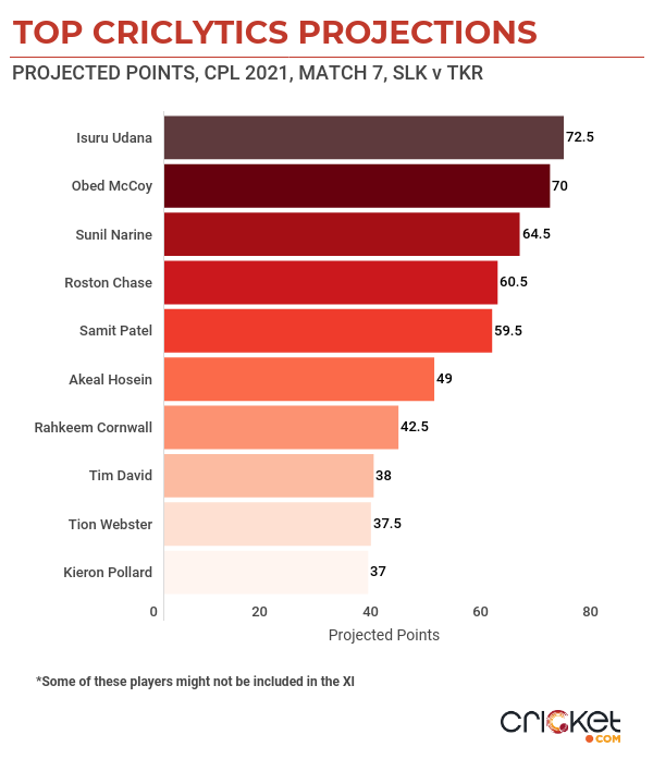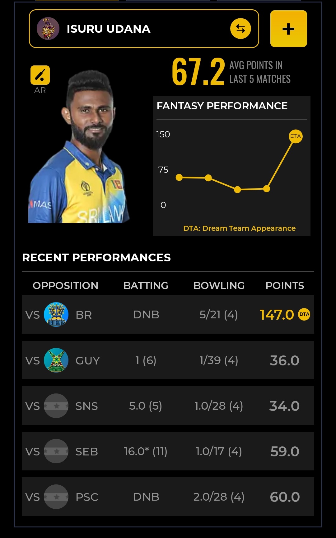 Oh, if you have watched the CPL this season, one name definitely should be on the top of the list for being your captain for this game – Isuru Udana. The left-arm pacer has already picked up six wickets this season, at an average of 10 and an economy rate of 7.50, striking every eight delivery. Last game, with his 5/21, with 147 points and he averages 67.2 points in the last five clashes.