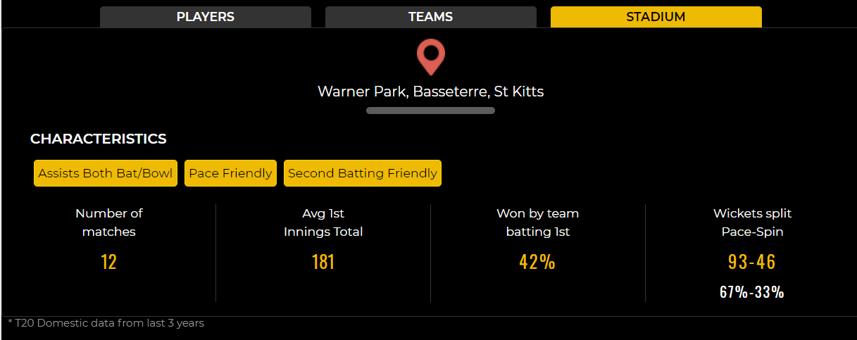 Four games into this year’s CPL, the Warner Park has provided all kinds of surfaces – good ones, the spin ones and definitely, the high-scoring one that we witnessed in the third game of the series. Now all of that combined, the 1st innings Average score at the Warner Park is 181, which suggests that good wickets might be on offer, on Sunday.
