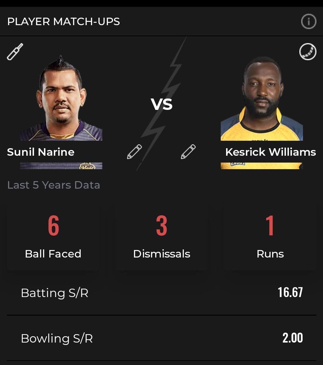 While Sunil Narine has started this season on a low with just 20 runs, his impact for the Trinbago Knight Riders in the last season was remarkable, with 144 runs, averaging 28.8 at a strike rate of 148.4 with 73.6% of his runs being in boundaries. But against the St. Lucia Kings, there is an evident weakness for the southpaw, who has been dismissed thrice by Kesrick Williams, with the left-hander just scoring one run. A batting strike rate of 16.67, Williams definitely has an edge over Narine.