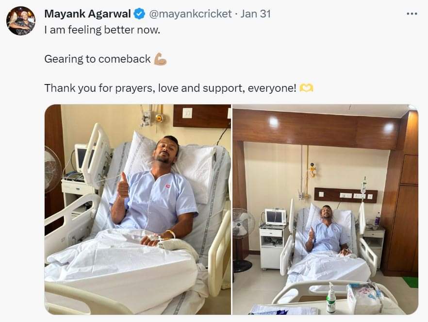 > Mayank Agarwal has reached Bengaluru safely after suffering a mid-flight medical emergency. Mayank was deboarded from the plane and rushed to a hospital in Agartala after he complained of irritation in his mouth and throat after consuming some liquid, which he thought was water that he consumed on the plane.