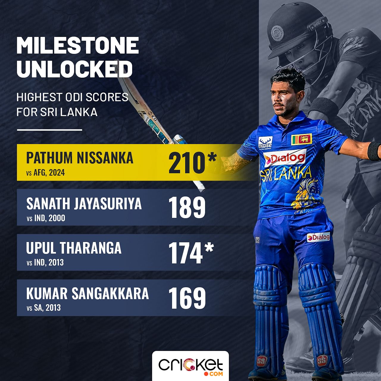 > Pathum Nissanka became the first double centurion for Sri Lanka, against Afghanistan in the first ODI of the three ODI series. His 210 (139) came in just 136 balls and is the third fastest double hundred of all time.