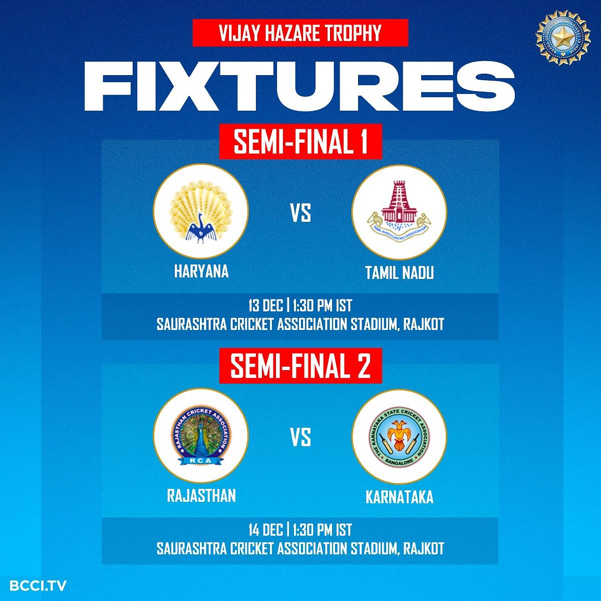 > Haryana will play Tamil Nadu, and Rajasthan will play Karnataka in the semifinals of the 2023/24 Vijay Hazare Trophy at the Saurashtra Cricket Stadium in Rajkot.