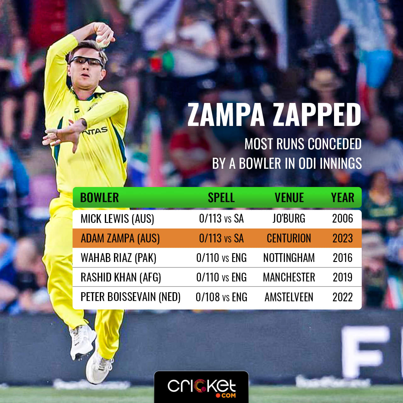 Poor Adam Zampa bore the brunt of this assault. He finished with 0/113 off his 10, the joint-worst figures in ODI history. He joined Mick Lewis, his (former) bowling coach at Renegades as the only other bowler to concede these many runs in an ODI đ€